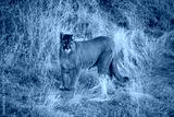 Cougar also called mountain lion, panther or puma hunting in a meadow in winter Colorado, USA