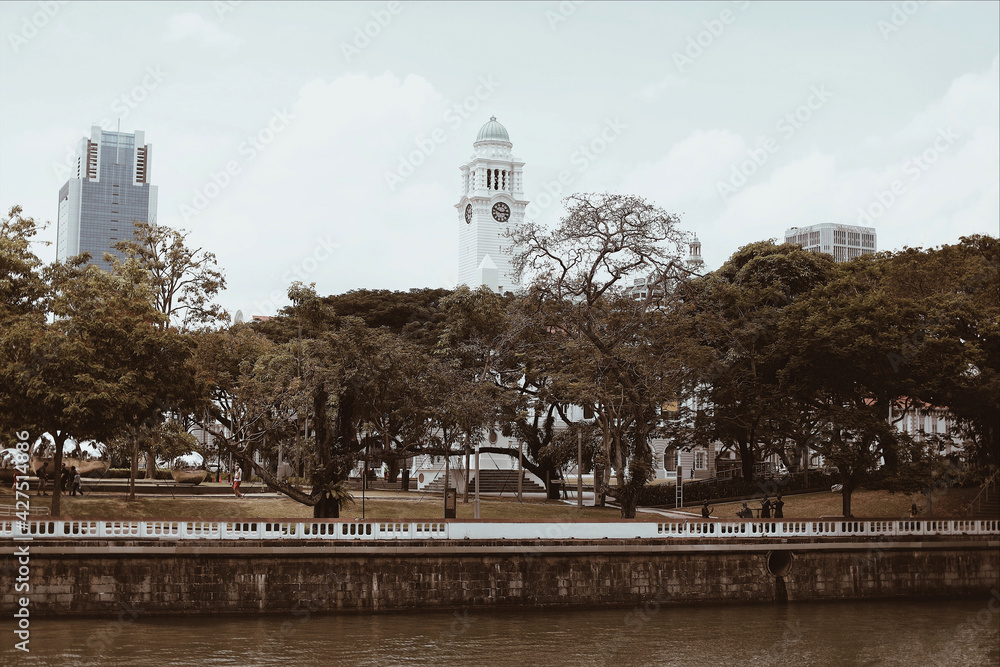 Beautiful view with river trees and buildings in Singapore city