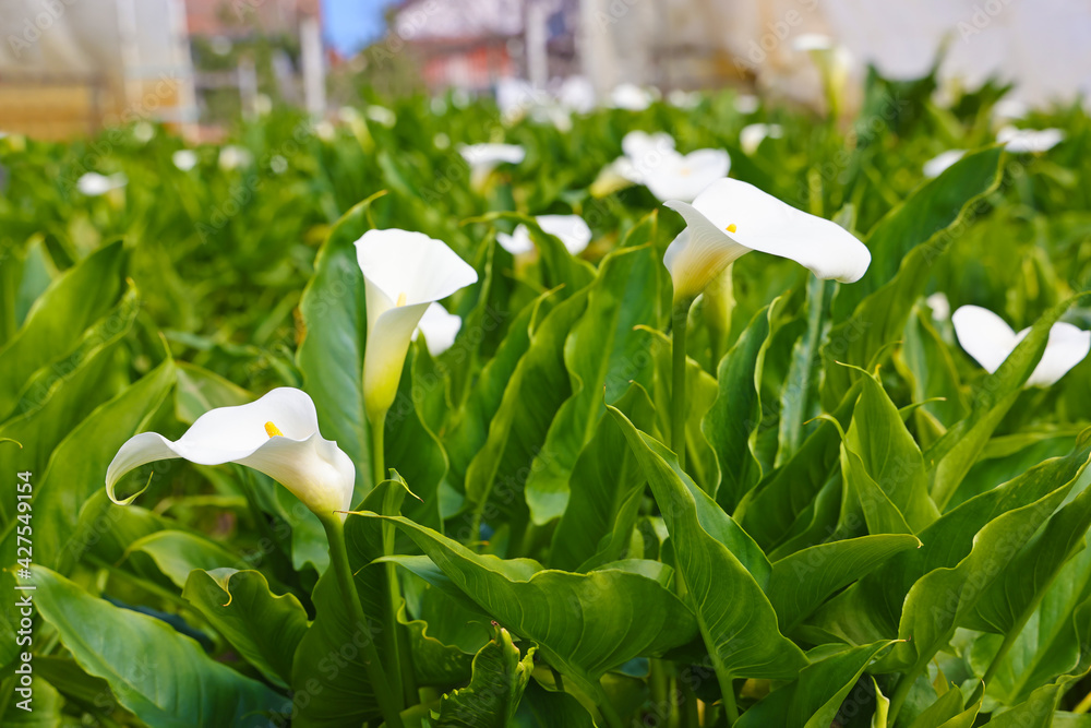 White Calla flowers in botanical garden