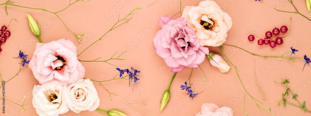 Summer flowers and berries simple pattern. Romantic floral banner or background. Composition in a pink pastel style for old fashioned greeting card or invitation.