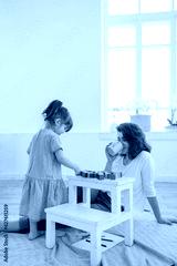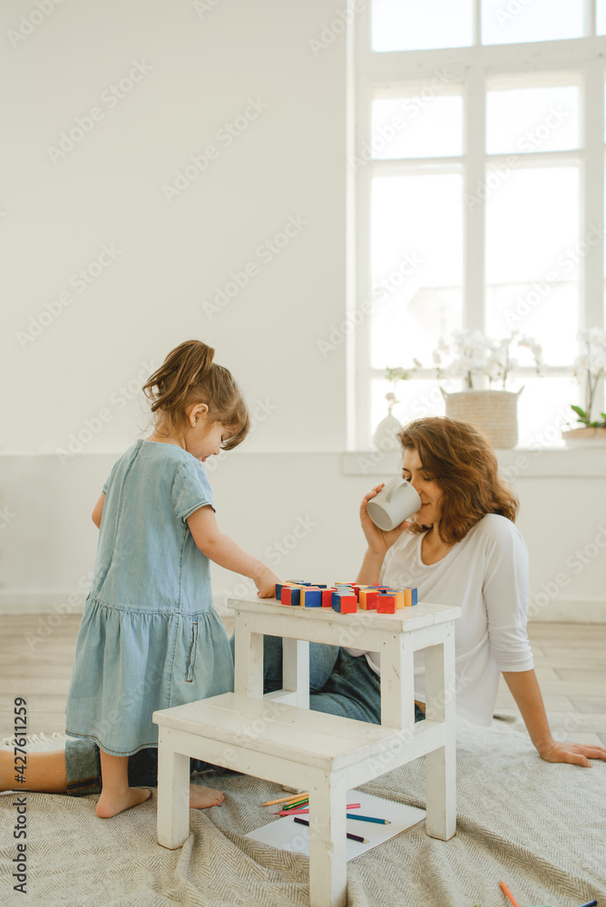 A young mother spends time with her little daughter at home.
