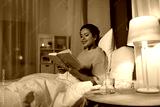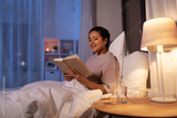 people, bedtime and rest concept - happy smiling young african american woman reading book in bed at home at night