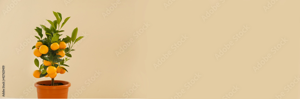 Tangerine tree banner.Mandarin Tree in a pot.Citrus fruit dwarf trees. Citrus fruit.Indoor fruit plants. seedlings and plants banner