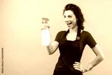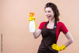 Young smiling housewife in yellow gloves, uniform apron isolated on beige background. Housekeeper woman is holding spray bottle with cleaner liquid. Cleaning lady is ready to wash house.