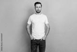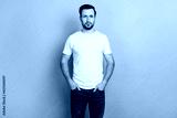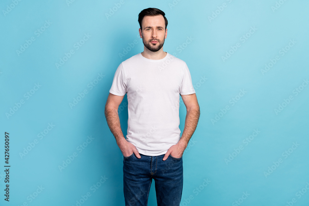 Portrait of attractive content guy expert specialist holding hands in pockets isolated over blue bright pastel color background