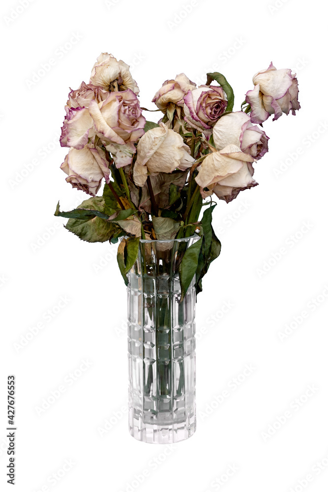 Bouquet of dried and withered roses in a crystal vase on a white background, isolate.