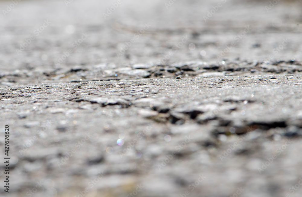 The texture of cracked road asphalt, selective focus, blurred background, perspective into the distance.