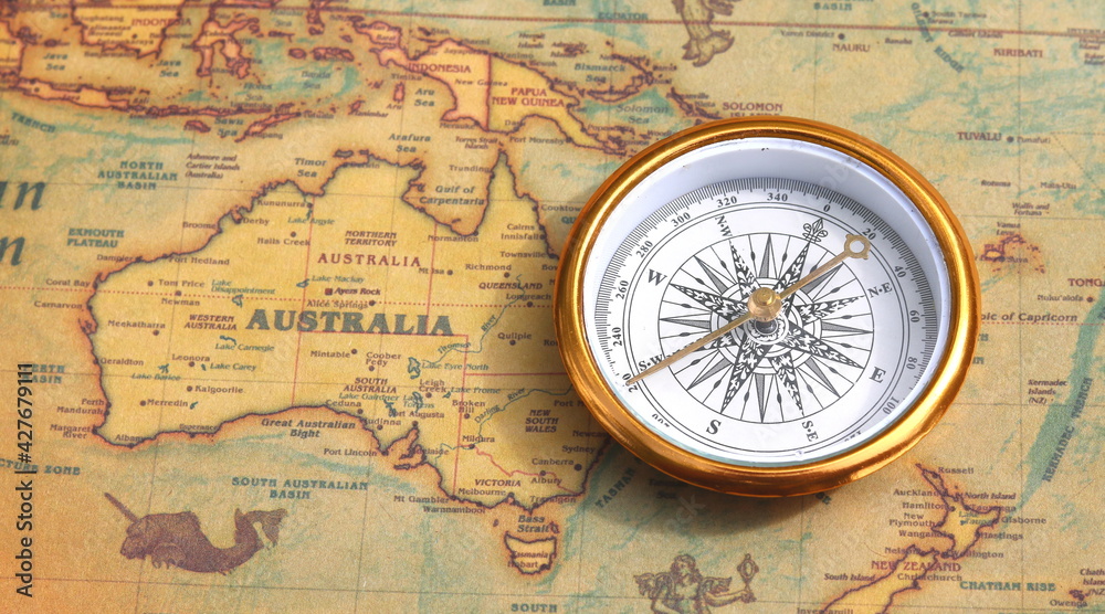 Classic round compass on background of old vintage map of world as symbol of tourism with compass, travel with compass and outdoor activities with compass