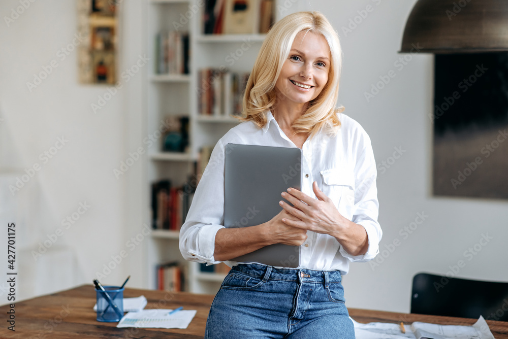 Portrait of successful mature intelligent caucasian business lady, stands in a modern office near workplace, dressed in stylish wear, holda laptop in hand, looks at the camera and friendly smiling
