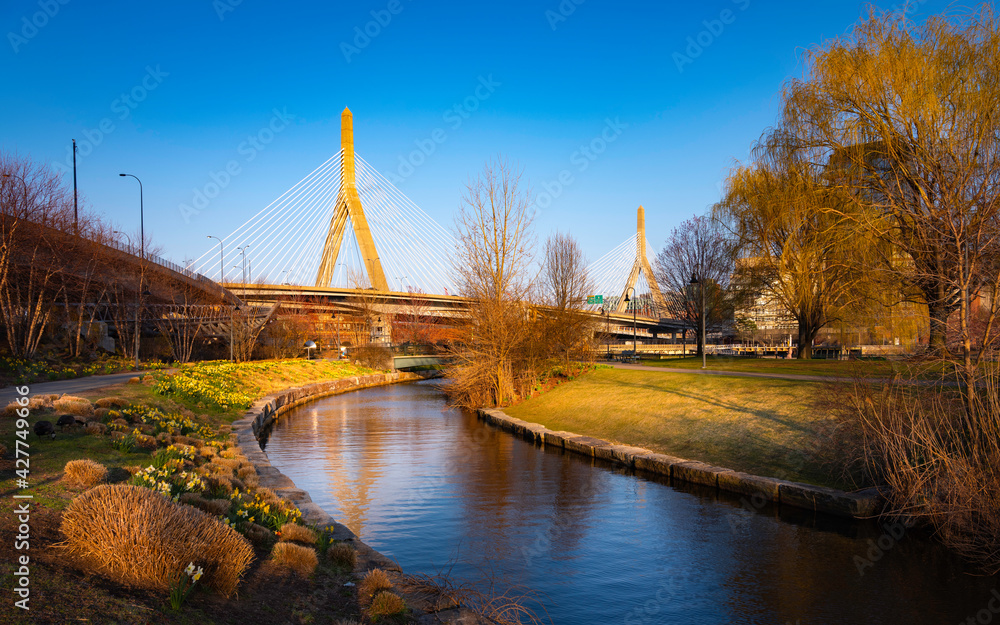 Peaceful North Point Park and Curving Canal Flowing toward Zakim Memorial Bridge on Charles River in Boston in April.