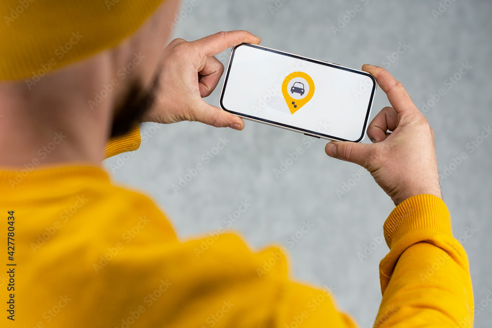 Online taxi on your phone. A man holds a smartphone with a white screen and a geolocation and location icon for a taxi.