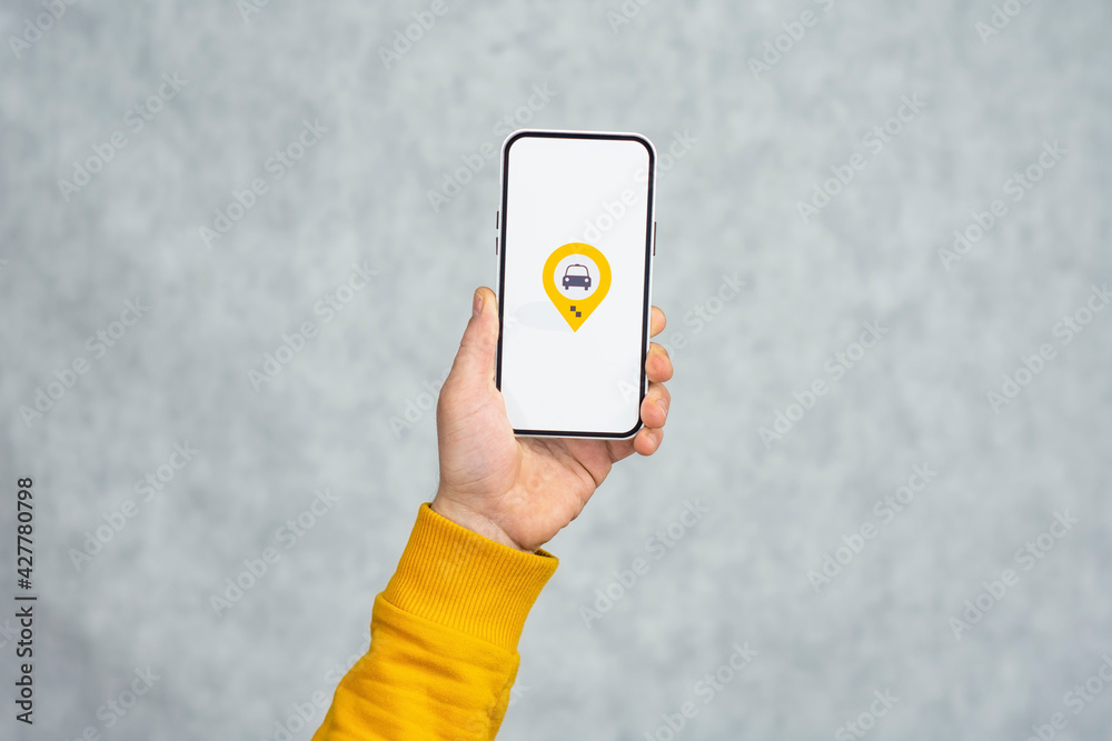 Phone display with Taxi icon on light background. Man holds a mockup smartphone in his hand close-up.