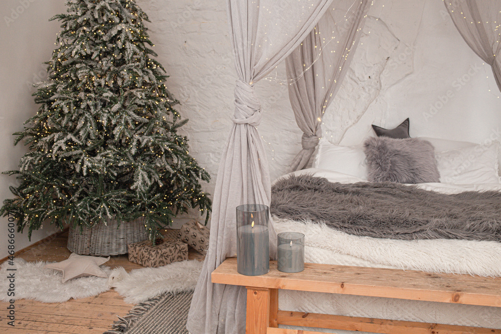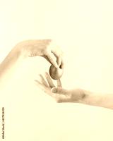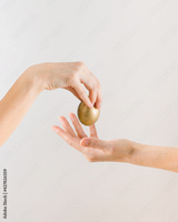 Beautiful woman's hand puts golden Easter egg in the other hand. Minimal creative Easter gift concept on the pastel beige background with a copy space.