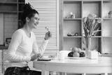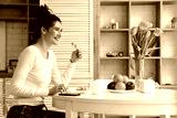 The side view of smiling woman bringing a piece of food while sitting at the table in the kitchen