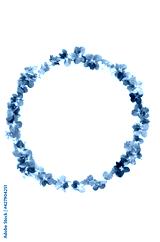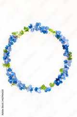 Frame in the form of a round wreath of spring blue flowers and leaves on a white background. View from above. Flat lay. Copy space.