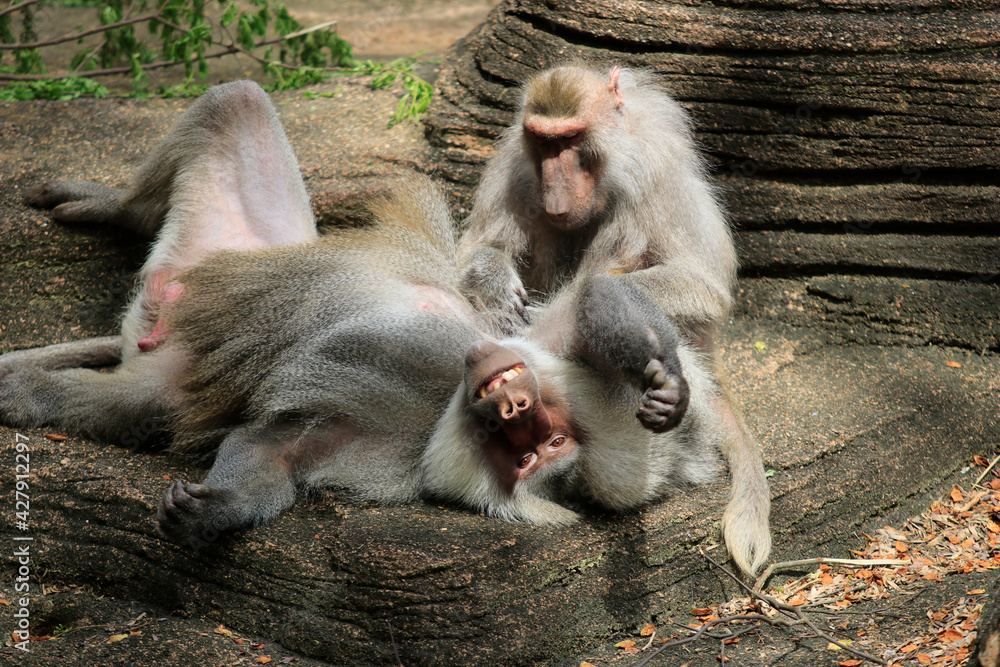 Hamadryas baboons preening with eye contact (papio hamadryas)