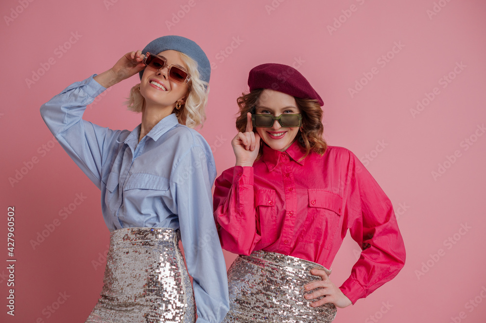 Two happy smiling women wearing stylish sunglasses, colorful shirts, berets, posing on pink background. Copy, empty space for text