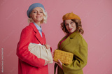 Spring fashion conception: happy smiling elegant women wearing stylish clothes, holding trendy leather bags posing on pink background. Copy, empty space for text