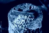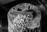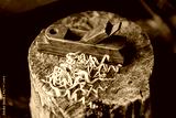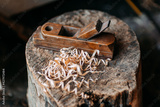 Old wooden jack plane with curly shavings. Wood shavings on old stump. Fresh curly sawdust. Wooden curls.