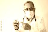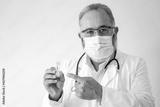 Portrait of senior doctor in surgical mask showing Covid-19 PCR result.