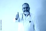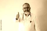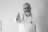 Portrait of senior bearded doctor in white coat smiling with thumbs up on white background.