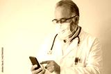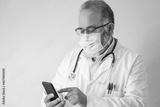 Portrait of senior bearded doctor in white coat using his smartphone on white background.