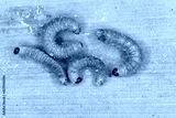 Larvae of fly from the family Bibionidae called March flies and lovebugs on soil. This insects live in soil and damaged plant roots.