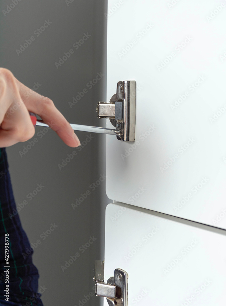 adjusting the furniture hinge of the home cabinet door with a screwdriver, hand with a screwdriver collects furniture, home life
