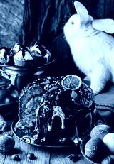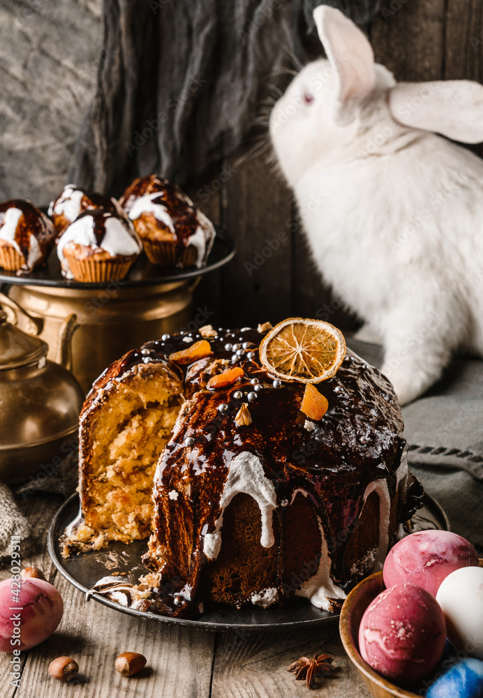 Easter cake with chocolate and nuts on rustic wooden table with colored easter eggs and white rabbit on backdrop. Happy Easter holiday