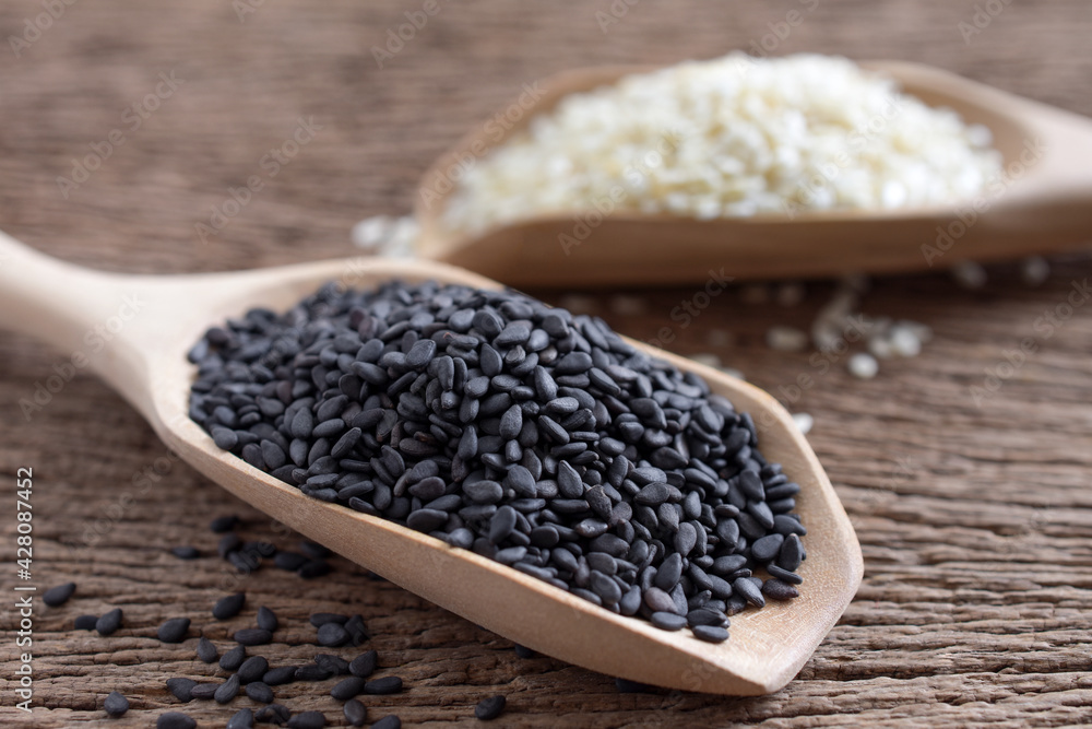Close up,Black sesame (Poppy) and white sesame seeds in wooden spoon on wooden background,copy space.