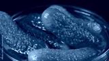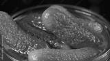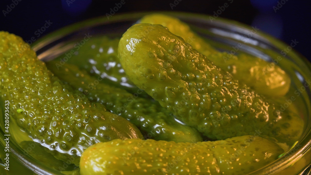 Photo of green gherkin in glass jar, close-up shooting