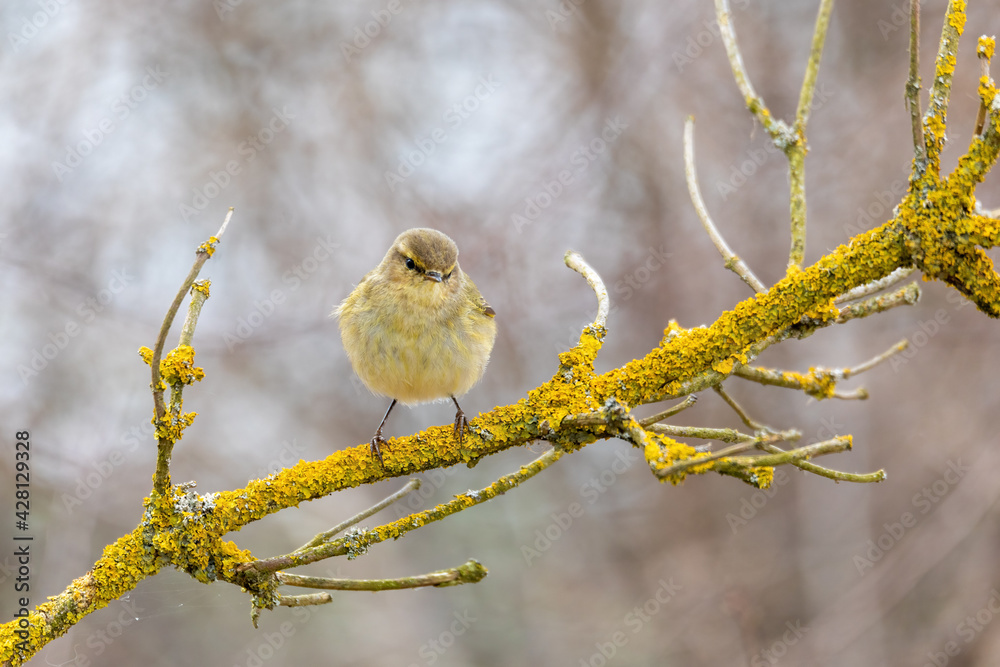 small song bird Willow Warbler (Phylloscopus trochilus) sitting on the branch. Little songbird in the natural habitat. Spring time. Czech Republic, Europe wildlife