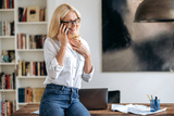 Happy friendly busy mature caucasian woman, business lady, in stylish wear and glasses, working at office, stands near desk, talking to colleague or client by smartphone, gesturing with hand, smiling