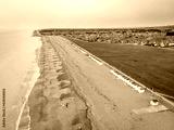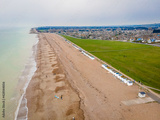Aerial view of beach cabins on the seaside of England