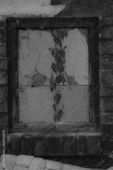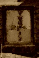 vivid stylised colours picture of red vine framed by window of derelict building
