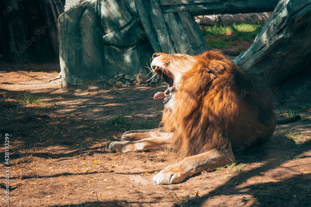 A majestic lion lying down at sunset in the zoo - Family attractions - Emirates Park Zoo and Resort, Abu Dhabi, UAE
