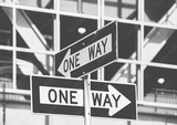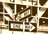 Black and white picture of One Way road signs in New York City, selective focus, USA.