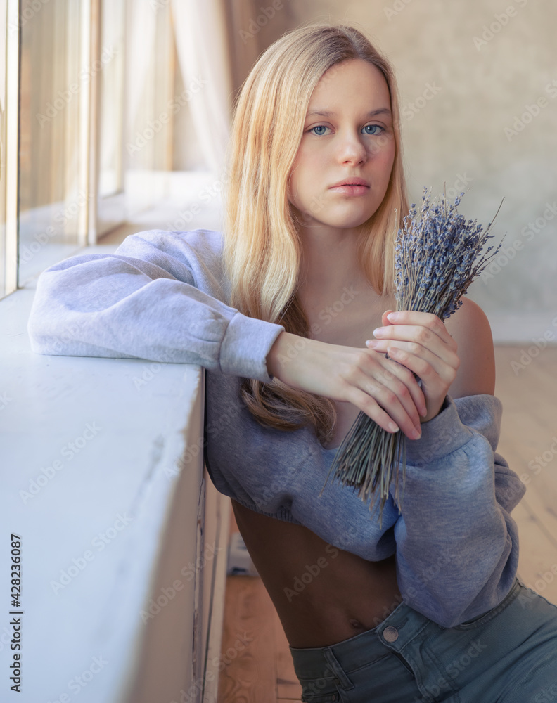 young white girl 16 years old with a gray sweatshirt with a bouquet of lavender in the room by the window