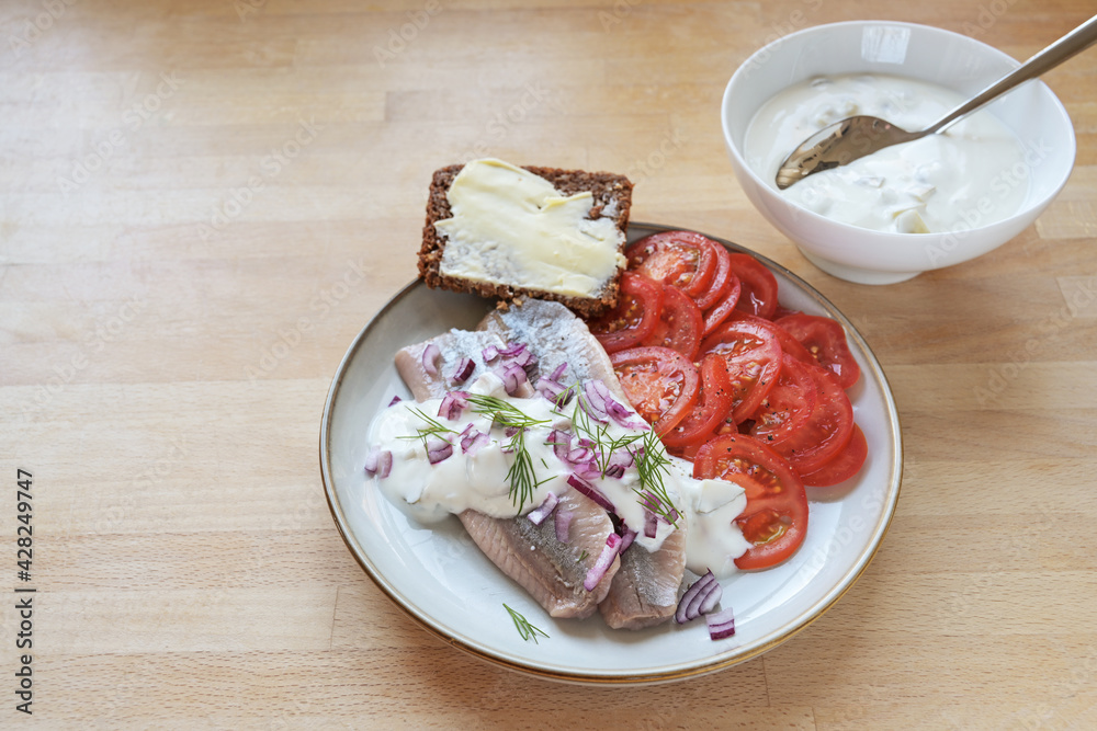 Salted herring fillets with sour cream sauce, red onions and dill on a plate with tomato slices and dark whole grainl bread, wooden table with copy space
