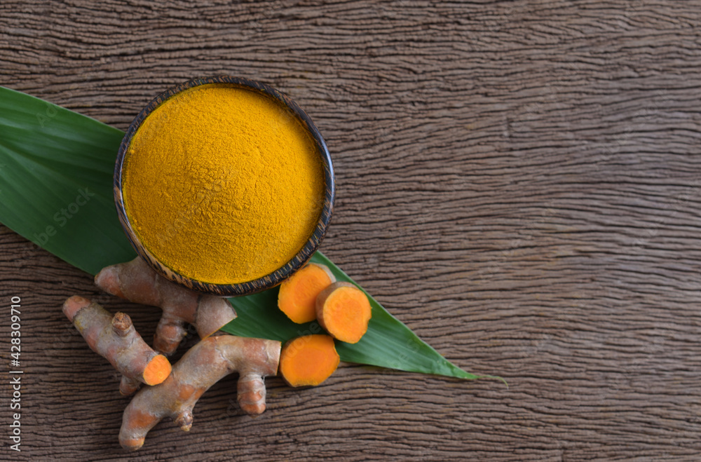 Turmeric (curcumin) powder in a wooden bowl and fresh turmeric rhizome on wooden background,Natural fabric dye,Top view,copy space.