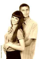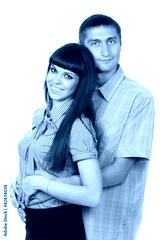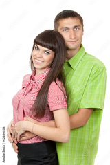 Beautiful couple in colored clothing. Studio portrait, isolate o