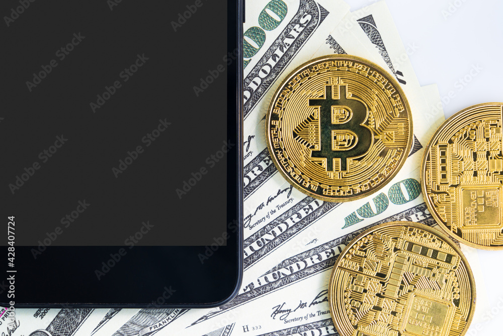 Top view Bitcoins coin and US banknotes of one hundred dollars with smartphone