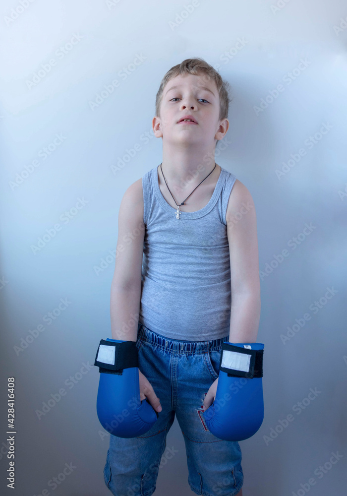 A small cute boy in blue boxing gloves stands in a boxing stance on a white background, home training, active sports lifestyle