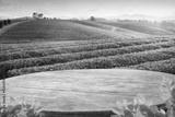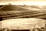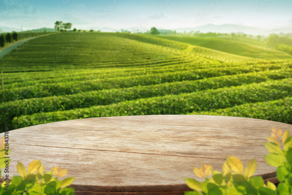 Wooden table top with blurry tea plantation landscape againt blue sky and blured green leave frame Product Dispaly stand background concept