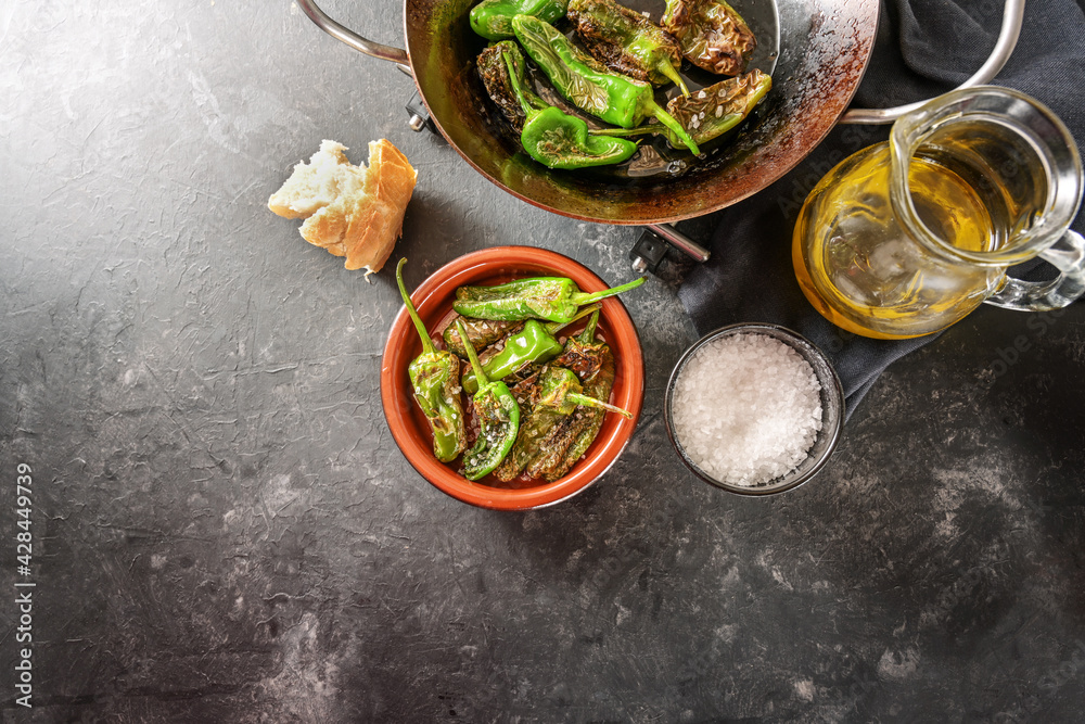 Fried peppers de padron or green pimientos in a pan and a traditional Spanish tapa bowl, salt, olive oil and bread on a dark gray background, copy space, high angle view from above