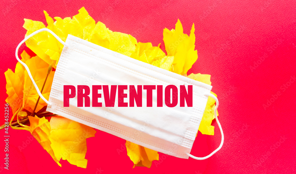 PREVENTION, text on a medical mask that lies on a red background next to yellow foliage. Medicine concept