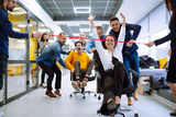 Friendly work team ride chairs in office room cheerfully excited diverse employees laugh while enjoying fun work break activities, creative friendly workers play a game together.
