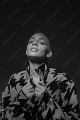 Woman wearing stylish coat adjusting her collar while standing at the studio