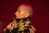 Female with nude makeup wearing stylish jacket posing at studio with red wall