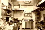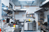 Restaurant kitchen without people. There is no one in kitchen of cafe. Concept - work in restaurant has been stopped. Small restaurant kitchen with chrome equipment. Dishes and products on tables.
